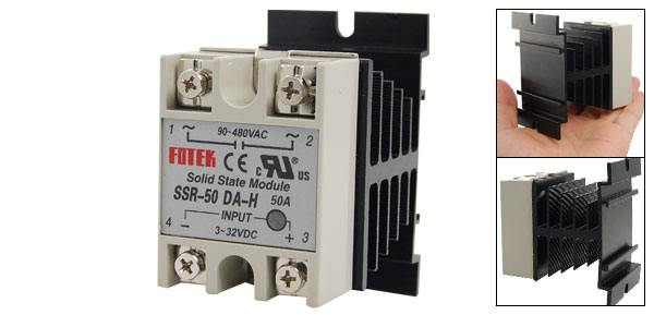 Product Name Heat Sink Solid State Relay Type SSR-50DA-H Material Relay: Metal, Plastic, Electric Parts Heat Sink: Aluminum Rated Load Current 50A Input DC 3-32V Output AC 90--480V Relay Size 6 x 4.5 x 2.2cm / 2.3" x 1.7" x 0.8" (L*W*H) Heat Sink Size 8.1 x 5 x 4.2cm/ 3.1" x 2" x 1.6"(L*W*H) Total Size 8.1 x 5 x 7.2cm/ 3.1" x 2" x 2.8"(L*W*H) Main Color Black, Gray Weight 211g Package Content 1 x Heat Sink Solid State Relay - Reviews