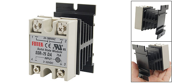 Product Name Solid State Relay + Heat Sink Type SSR-75DA Material Relay: Metal, Plastic, Electric Parts Heat Sink: Aluminum Rated Load Current 75A Input DC 3-32V Output AC 24-380V Relay Size 6 x 4.5 x 2.2cm / 2.3" x 1.7" x 0.8" (L*W*H) Heat Sink Size 8.1 x 5 x 4.2cm/ 3.1" x 2" x 1.6"(L*W*H) Total Size 8.1 x 5 x 7.2cm/ 3.1" x 2" x 2.8"(L*W*H) Main Color Black, Gray Weight 212g Package Content 1 x Solid State Relay