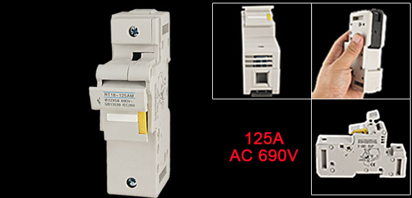 Product Name Fuse Holder Type RT18-125AM Fit Fuse Type 22 x 58mm / 0.866" x 2.283"(D*H)(Not Included Here) Rated Voltage AC 690V Rated Current 125A Poles Quantity 1P Material Hard Plastic & Metal Color See the Picture Overall Size(Approx) 12.9 x 3.5 x 7.6cm / 5.1" x 1.4" x 3"(L*W*H)