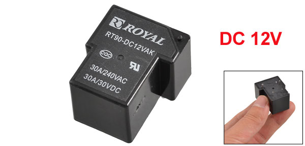 Product Name Relay Material Plastic, Metal Color Black Type RT90-DC12VAK Coil Voltage DC 12V Rated Load 30A 240VAC / 30A 30VDC Size (Approx.) 3.1x 2.6 x 1.9cm/1.2" x 1" x 0.7" (L*W*T)