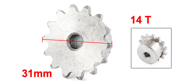Product Name Chain Drive Sprocket Teeth Number 14T Tip Inner Hole Dia 6mm /1/4" Tip Outer Dia 31mm / 1.2" Tip Thickness 3mm/0.12" Shaft Dia 22mm/0.86" Total Height 15mm/0.59" Material Stainless Steel Color Gray Net Weight 46g Package Content 1 x Chain Drive Sprocket - Reviews
