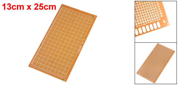 Product Name Universal PCB Board Hole Dia(Approx) 0.1mm / 0.039" Hole Pitch(Approx) 2.54mm / 0.1" Size(Approx) 13 x 25cm /5.1" x 9.8"(W*L) Thickness(Approx) 1.5mm / 0.06“ Install Hole Dia 3mm/0.12" Install Hole Distance 24 x 12cm/9.4" x 4.7"(L*W) Material Copper PCB Color Copper Tone Weight 60g Package Content 1 x Universal PCB Board - Reviews