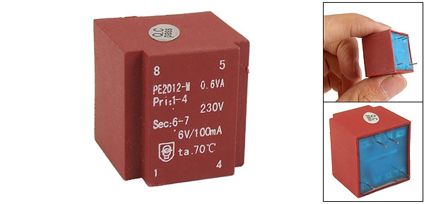 Product Name Encapsulated Transformer Model No. PE2012-M Primary Work Voltage 230V Work Frequency 50-60Hz Insulation Grade Grade B Power 0.6VA Primary Pin 1-4 Secondary Pin 6-7 Secondary Full-load Voltage 1 x 6V Secondary No-load Voltage 1 x 10.8V Secondary Output Current 100mA Mounting Height 22mm/0.866" Number of Pins 4 Pin Diameter 0.6mm/0.0236" Overall Size(Approx.) 23.5 x 22.5 x 27mm/0.93" x 0.88" x 1.06"(L*W*H) Material Epoxy Resin Color Red Weight 43g Package Content 1 x Encapsulated Transformer - Reviews