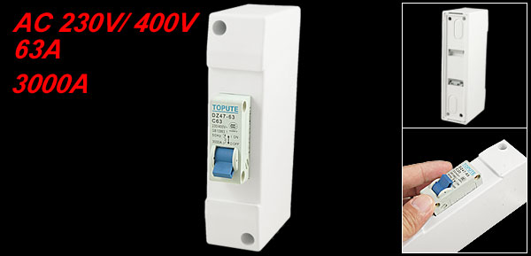 Product Name Circuit Breaker w Cover Model No. DZ47-63 C63 Material Plastic, Electric Components Rated Voltage AC 230V/ 400V Rated Current 63A Breaking Capacity 3000A Frequency 50Hz Total Size (Approx.) 12.8 x 3.4 x 7cm / 5" x 1.3" x 2.7" (L*W*T) Number of Poles 1 Color White, Gray, Blue Weight 140g Package Content 1 x Circuit Breaker w Cover - Reviews