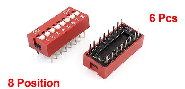 Product Name DIP Switch Type Slide Type Poles 8 Position 16Pin (2Row) Pitch 2.54mm Non-Switching Rating 100mA DC 50V Switching Rating 100mA DC 24V Dimension 22 x 10 x 9mm/ 0.87" x 0.4" x 0.35"(L*W*H) Material Plastic, Electric Parts Main Color Red, Gold Tone Weight 9g Package Content 6 Pcs x DIP Switches - Reviews