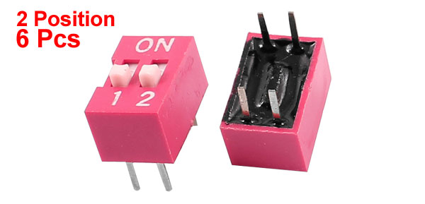 Product Name DIP Switch Type Slide Type Poles 2 Position 4Pin (2Row) Pitch 2.54mm Non-Switching Rating 100mA DC 50V Switching Rating 100mA DC 24V Dimension 10 x 6.5 x 10mm/ 0.4" x 0.26" x 0.4"(L*W*H) Material Plastic, Electric Parts Main Color Fuchsia, Gold Tone Weight 3g Package Content 6 Pcs x DIP Switches - Reviews