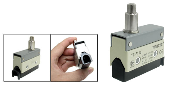 Product Name Limit Switch Model No. TZ-7110 Conact Configuration 1NO,1NC(SPDT) Actuator Action Momentary Actuator Type Slim Spring Plunger Ui 380V Ith 10A AC-15 Ue: 250V, le: 1.5A DC-13 Ue: 220V, le: 0.3A Switch Body Size ~5.3 x 2.1 x 4.1cm / 2.1 x 0.8 x 1.6"(L*W*H) Fixing Holes Dia. ~0.43cm / 0.17“ Distance Between Centers of Fixing Holes ~2.5cm / 0.98" Actuator Size 2.5 x 1.18cm / 1" x 0.5"(H*Max.D) Color Grey, Black Net Weight 73g Package Content 1 x Limit Switch - Reviews