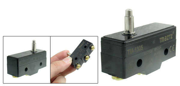 Product Name Limit Switch Model No. TM-1305 Conact Configuration 1NO,1NC(SPDT) Actuator Action Momentary Actuator Type Slim Spring Plunger Terminal 3 Screw Terminal Ui 380V Ith 15A AC-15 Ue: 250V, le: 1.5A DC-13 Ue: 220V, le: 0.3A Switch Body Size ~4.8 x 1.7 x 2.3cm / 1.9 x 0.7 x 0.9"(L*W*H) Fixing Holes Dia. ~0.44cm / 0.17" Distance Between Centers of Fixing Holes ~2.5cm / 0.98" Actuator Size 1.4 x 0.5cm / 0.6" x 0.2"(L*Max.D) Color Black Net Weight 32g Package Content 1 x Limit Switch - Reviews