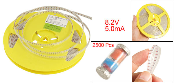 Max. Impedance 7.0Ω Voltage Range 7.7-8.7V Material Electric Parts Quantity 2500±2% Pcs Solder Parts Thickness 0.5mm/ 0.019" Overall Size(Each) 3.7 x 1.6mm / 0.145" x 0.063"(L*D) Reel Size 179 x 15mm / 7" x 0.6" (D*T) Color As Picture Shown Weight 143g Package Content 2500 x Zener Diodes - Reviews