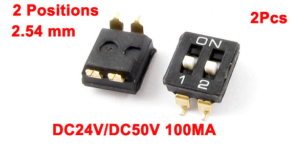 Product Name DIP Switch Type SMD Features 2 Positions ( 2 Row 4 Pin) Pitch 2.54 mm / 0.1" Non-Switching Rating 100mA DC 50V Switching Rating 100mA DC 24V Contact resistance 50mΩ 24VDC/100mA (at initial) 100mΩ typical, 24VDC/100mA (after life test) Each Size 10 x 6 x 4.5 mm / 0.4" x 0.24" x 0.18" (L*W*H) Main Material Plastic, Metal Color Gold Tone, White, Black Net Weight 1g Package Content 2 x DIP Switch - Reviews