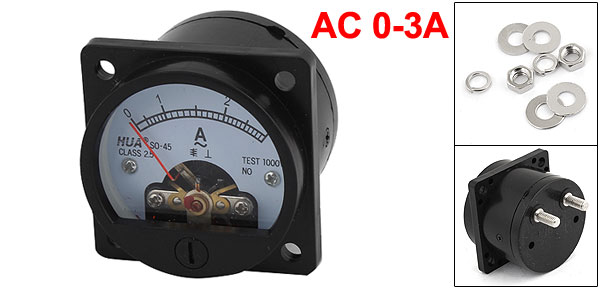 DetailsSO-45 Class 2.5 Accuracy AC 0-3A Analog Ammeter Panel Meter Black  Product Name Panel Ammeter Model SO-45 Measuring Current Range AC 3A Accuracy Class 2.5 Round Meter Face Dia(Approx.) 4.5cm/ 1.8" Screw Size 4.8 x 15mm/ 0.19" x 0.6" Total Size 47 x 36mm/ 1.9" x 1.4"(W*H) Color Black, White Net Weight 50g Package Content 1 x Panel Ammeter Several Installing Parts