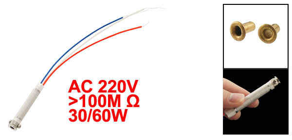 Product Name Soldering Iron Heating Core Main Material Metal, Nylon Voltage AC 220V 50Hz Insulation Resistance >100M Ω Power 30/60W Dimension 6.5 x 1.2cm/ 2.5" x 0.47"(L*D) Wire Length 8cm/ 3.1" Color White, Silver Tone Weight 12g Package Content 1 x Soldering Iron Heating Core - Reviews