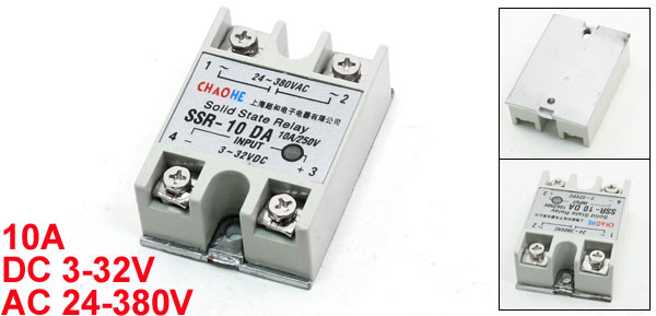 Product Name Solid State Relay Type SSR-10 DA Rated Load Current 10A Input DC 3-32V Output AC 24-380V Total Size (Approx.) 6.3 x 4.5 x 2.3cm/ 2.5" x 1.8" x 0.9"(L*W*T) Material Plastic, Electric Part Color Gray, Silver Tone Weight 116g Package Content 1 x Solid State Relay