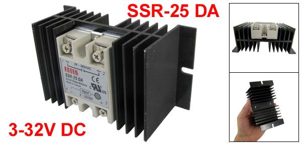 Product Name Solid State Relay + Heat Sink Model No. SSR-25 DA Material Metal, Aluminum, Plastic Load Current 25A Load Voltage 24-380V AC Control Voltage 3-32V DC Total Size (Approx.) 126 x 70 x 52mm / 5.0" x 2.8" x 2.0" (L*W*H) Weight 314g Package Content 1 x Solid State Relay + Heat Sink - Reviews