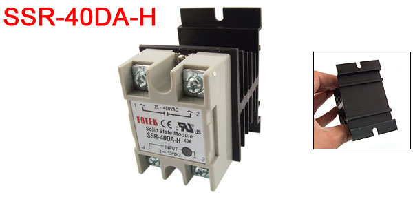 Product Name Solid State Relay w Heatsink Type SSR-40DA-H Material Relay: Metal, Plastic, Electric Parts Heat Sink: Aluminum Rated Load Current 40A Input AC 3-32V Output AC 75-480V Relay Size 5.7 x 4.2 x 2.5cm / 2.2" x 1.7" x 1" (L*W*T) Heat Sink Size 8 x 5 x 5cm/ 3.1" x 2" x 2"(L*W*H) Total Size 8 x 5 x 7.6cm/ 3.1" x 2" x 3"(L*W*H) Main Color Black, Gray Weight 197g Package Content 1 x Solid State Relay w Heatsink - Reviews