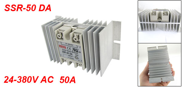 Product Name Solid State Relay + Heat Sink Model No. SSR-50 DA Load Current 50A Load Voltage 24-380V AC Control Voltage 3-32V DC Mounting Hole Diameter 5mm / 0.2" Total Size (Approx.) 126 x 70 x 52mm / 5.0" x 2.8" x 2.0" (L*W*H) Heatsink Material Aluminum Color Silver Tone Weight 287g Package Content 1 x Solid State Relay + Heat Sink - Reviews
