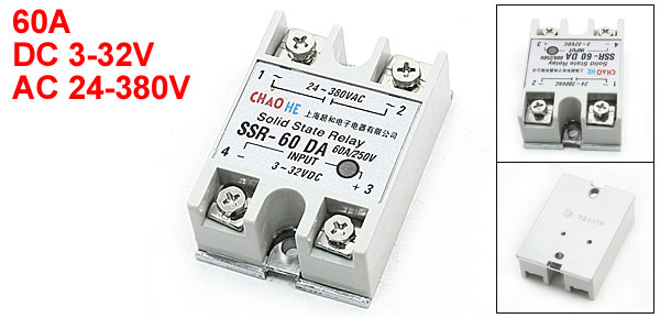 Product Name Solid State Relay Type SSR-60 DA Rated Load Current 60A Input DC 3-32V Output AC 24-380V Total Size (Approx.) 6.3 x 4.5 x 2.3cm/ 2.5" x 1.8" x 0.9"(L*W*T) Material Plastic, Electric Part Color Gray, Silver Tone Weight 116g Package Content 1 x Solid State Relay