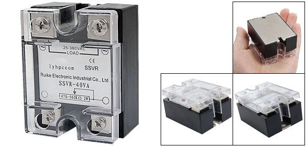 Product Name Adjustable Solid State Relay Model SSVR-40VA Material Metal, Plastic, Electric Parts Rated Load Current 40A Power 2W Load Voltage AC 25-380V Potentiometer Input Resistance 470-560KΩ (Potentiometer is Not Included) Relay Size 5.7 x 4.5 x 3.2cm/ 2.2" x 1.8" x 1.2" (L*W*T) Main Color Black, Clear Weight 89g Package Content 1 x Adjustable Solid State Relay - Reviews