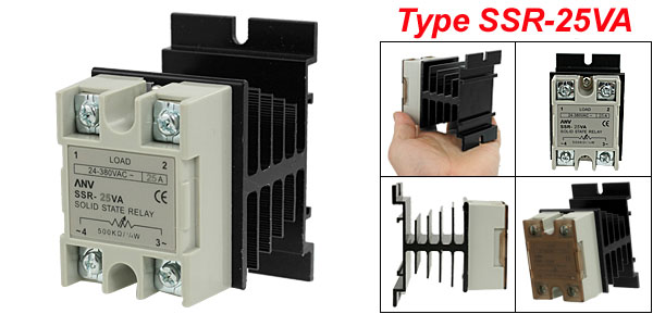 Product Name Solid State Relay Voltage Resistance Regulator + Heat Sink Type SSR-25VA Material Relay: Metal, Plastic, Electric Parts Heat Sink: Aluminum Rated Load Current 25A Potentiometer Input Resistance 500KΩ (Potentiometer is Not Included) Output Voltage AC 24--380V Relay Size 5.7 x 4.4 x 2.5cm / 2.2" x 1.7" x 1" (L*W*T) Heat Sink Size 8.1 x 5 x 5cm/ 3.1" x 2" x 2"(L*W*H) Total Size 8.1 x 5 x 7.6cm/ 3.1" x 2" x 3"(L*W*H) Main Color Black, Gray Weight 200g Package Content 1 x Solid State Relay Voltage Resistance Regulator