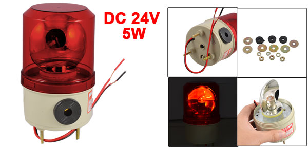 DetailsSound Alarm Red Rotating Flashing Light Signal Industrial Lamp DC 24V 5W  Product Name Industrial Signal Light Model LTE-1081J Type Rotating Flash Light w Buzzer Rated Voltage DC 24V Power 5W Light Color Red External Material Plastic, Metal Size 8 x 13cm/ 3.1" x 5.1" (D*H) Thread Dia. 3.8mm/ 0.15" Cable Length 15cm/ 6.9" Body Color Red, Beige Net Weight 210g Package Content 1 x Industrial Signal Light Several Install Parts