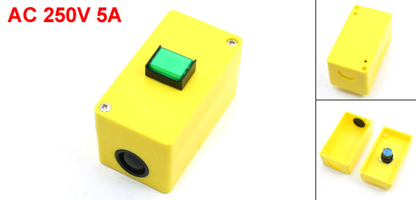 Product Name Push Button Station Action Type Momentary Contact Type SPDT 1NC 1NO Working Voltage & Current 5A 250VAC Light Voltage 24V Light Color Green Overall Size 9 x 6 x 5cm/3.5" x 2.4" x 2"(L*W*H) Wire Hole Dia 22mm/0.87" Mounting Hole Dia 4.3mm/0.17" Mount Hole Distance 60mm x 35mm/2.4" x 1.4"(L*W) Material Plastic, Metal Color Green, Black, Yellow Net Weight 64g Package Content 1 x Push Button Station - Reviews