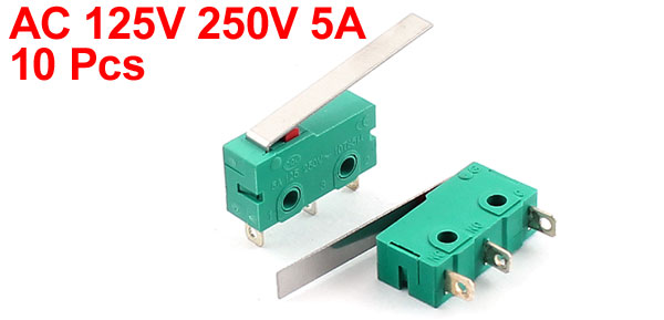 Main Color Greeb Country of Manufacture CHINA Action Type Momentary Actuator Type Long Hinge Lever Material Plastic, Metal Contact Type SPDT 1NO 1 NC Level Size 28 x 4mm/1.1" x 0.16"(L*W) Total Size 19 x 6 x 9.5mm/0.75" x 0.24" x 0.37(L*W*H) Product Name Micro Limit Switch Pins 3 Net Weight 23g Rated AC 125V/250V 5A Package Content 10 Pcs x Micro Limit Switch - Reviews