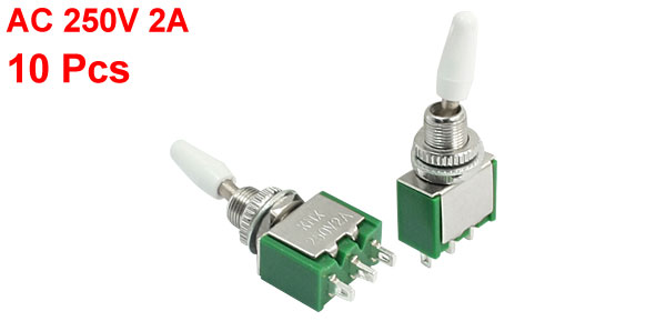 Product Name Toggle Switch Type SPDT, NO NC (Latching) Position 2 Positions Voltage, Current AC 250V 2A Mounting Thread Diameter 5 mm / 0.2" Main Body Size 1.2 x 0.6 x 1 cm / 0.47" x 0.24" x 0.4" (L*W*H) Overall Height 3cm / 1.2" Color Green, Silver Tone Net Weight 50g Package Content 10 x Toggle Switch - Reviews