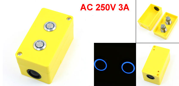 Product Name Push Button Station Action Type Momentary Blue Round Flat Button Contact Type 1NO 1NC Working Voltage & Current 3A 250VAC Max. Withstand Current 16A Light Voltage 24V Light Color Blue Button Dia 1.8cm / 0.71" Overall Size 9 x 5 x 5cm / 3.5" x 2" x 2"(L*W*H) Wire Hole Dia 20mm/0.78" Mounting Hole Dia 4mm/0.16" Mount Hole Distance 60mm x 35mm / 2.4" x 1.4"(L*W) Material Plastic, Metal Color Yellow, Silver Tone, Blue Net Weight 82g