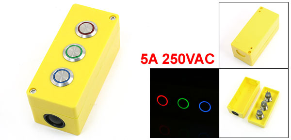 Product Name Push Button Station Action Type Momentary Red Green Blue Round Flat Button Contact Type 1NO 1NC Working Voltage & Current 5A 250VAC Max. Withstand Current 19A Light Voltage 12V Light Color Red, Green, Blue Button Dia 2.2cm / 0.9" Overall Size 11.5 x 5 x 5cm / 4.1" x 2" x 2"(L*W*H) Wire Hole Dia 20mm/0.78" Mounting Hole Dia 4mm/0.16" Mount Hole Distance 86mm x 35mm / 3.4" x 1.4"(L*W) Material Plastic, Metal Color Green, Red, Yellow, Silver Tone, Blue Net Weight 113g