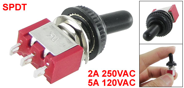 Product Name Toggle Switch Type SPDT (ON/Off/ON), Latching Position 3 Mounting Hole Diamter 5.8mm / 0.228" Voltage & Current 2A/250VAC 5A/120VAC Main Body Size 12.9 x 7mm / 0.5" x 0.27"(L*W) Overall Heigh 33mm / 1.3" Material Metal, Resin & Rubber Color Red, Silver Tone & Black Weight 7g Package Content 1 x Toggle Switch - Reviews