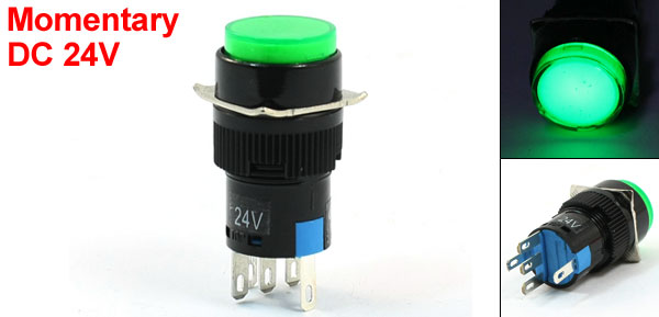 Item Name Push Button Switch Contact Type Momentary SPDT Working Voltage AC 250V 3A DC 30V 5A Light Color Green Lamp Voltage DC24V Mounting Thread Diameter 15mm / 0.6" Button Cap Dia 15mm /0.6" Terminals 5 Pin Overall Size 4 x 1.8 x 1.8cm/1.6" x 0.7" x 0.7"(L*W*T) Material Plastic, Electronic Parts Weight 7g Package Content 1 Pcs x Push Button Switch - Reviews