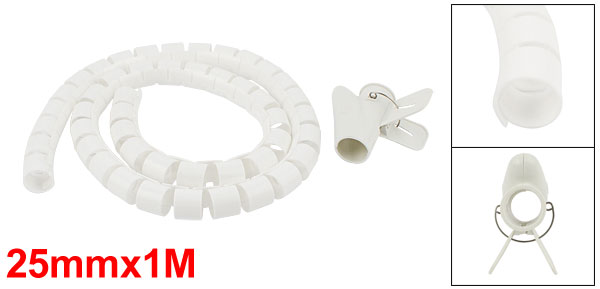 Spiral Tube Cable Wire Wrap Organizer PC Cord Management w Clip 25mmx1m White