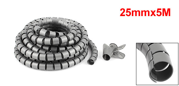 Spiral Tube Cable Wire Wrap Organizer PC Cord Management w Clip 25mmx5m Gray