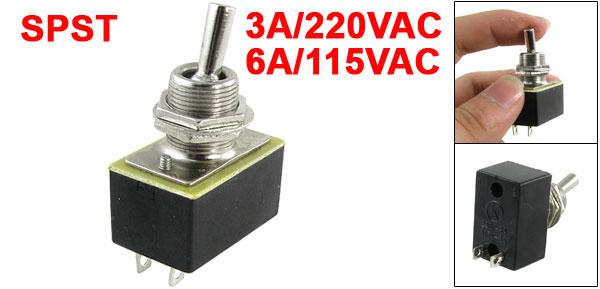 Product Name Toggle Switch Type SPST (ON/OFF) Position 2 Mounting Hole Diamter 11.6mm / 0.456" Voltage & Current 3A/220VAC 6A/115VAC Main Body Size 28 x 17.8 x 14.9mm / 1.1" x 0.7" x 0.6"(L*W*H) Overall Height 44.6mm / 1.8" Material Metal & Resin Color Black Weight 18g Package Content 1 x Toggle Switch - Reviews