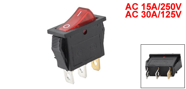 Item Name Rocker Switch Type On/OFF (SPST) Terminals 3 Pin Voltage & Current AC 15A/250V, AC 30A/125V Overall Size 3.5 x 3.2 x 1.3cm/ 1.4" x 1.3" x 0.51"(L*W*T) Mounting Size 30 x 1.3mm / 0.8" x 0.5"(L*W) Color Black, Red Material Plastic, Metal Total Net Weight 7g Package Content 1 x Rocker Switch - Reviews