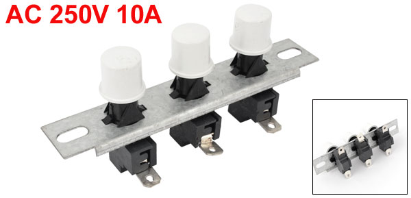 Item Name Push Button Switch Action Type Self Locking Contact Type SPST Current 10A Voltage AC 250V Button Color White Button Diameter 1.2cm / 0.47" Total Size 10 x 3.5 x 4.2cm / 3.9" x 1.4" x 1.7"(L*W*H) Material Plastic, Metal Weight 26g Package Content 1 Row x Push Button Switch - Reviews
