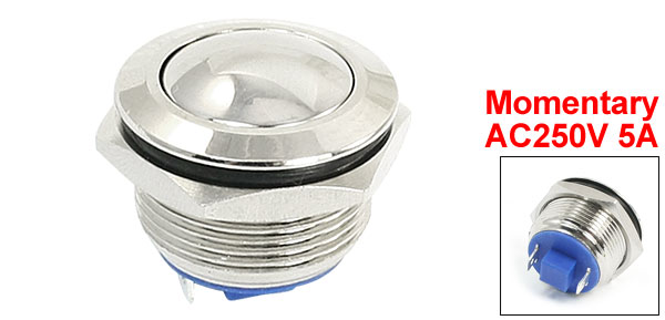 Item Name Push Button Switch Action Type Momentary Head Shape Ball Head Contact SPST(ON/OFF) Switch Rating AC250V 5A Pin Number 2 Thread Diameter 19mm/ 0.95" Total Size 21 x 22mm/ 0.83" x 0.87" (L*Max.W) Main Material Metal Color Silver Tone Weight 14g Package Content 1 x Push Button Switch - Reviews