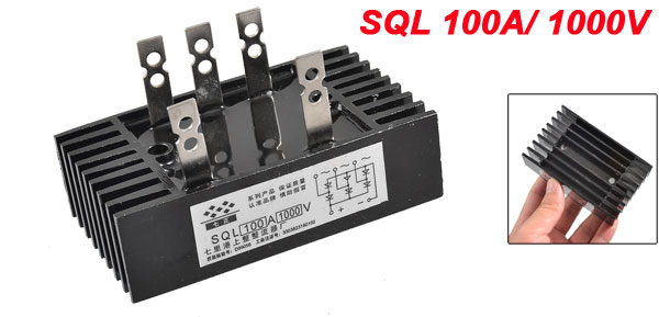 Product Name Bridge Rectifier Model SQL 100A/ 1000V Output Current (DC) 100A Repetitive Peak Reverse Voltage (AC) 1000V Fixing Holes Diameter 5.8mm / 0.23" Fixing Holes Spacing 52mm / 2" Main Body Size 10 x 6 x 2.8cm/ 3.9" x 2.4" x 1.1" (L*W*T) Overall Height 54mm/ 2.1" Material Metal, Plastic Color Black, Silver Tone Net Weight 261g Package Content 1 x Bridge Rectifier - Reviews