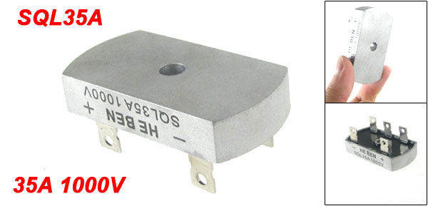 Product Name Bridge Rectifier Model No. SQL35A Output Current(DC) 35A Repetitive Peak Reverse Voltage(AC) 1000V Repetitive Peak Reverse Current 7mA Insulation Voltage 2500V Fixing Hole Diameter 6mm / 0.24" Overall Size(Approx.) 61 x 32 x 24mm / 2.4" x 1.3" x 0.9" (L*W*H) Material Aluminum, Plastic Net Weight 43g Package Content 1 x Bridge Rectifier - Reviews