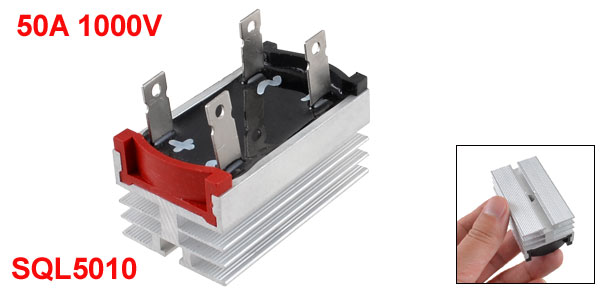 Product Name Bridge Rectifier Model No. SQL5010 Mean On-State Current 50A Peak Reverse Voltage 1000V RMS Voltage 1000V Operating Temperature -40°C ~ +150°C Body Size 60 x 35 x 40mm/ 2.4" x 1.4" x 1.6" (L*W*H) Pin Number 5 Pin Size 16 x 8mm/ 0.63" x 0.31" (L*W) Color Silver Tone, Black, Red Material Plastic, Metal, Aluminum Weight 87g Package 1 x Bridge Rectifier - Reviews