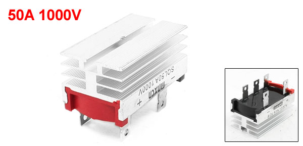 Product Name Bridge Rectifier Model No. SQL50A1000V Mean On-State Current 50A Peak Reverse Voltage 1000V RMS Voltage 1000V Operating Temperature -40°C ~ +150°C Body Size 60 x 35 x 40mm/ 2.4" x 1.4" x 1.6" (L*W*H) Pin Size 16 x 8mm/ 0.63" x 0.31" (L*W) Color Silver Tone, Black, Red Material Plastic, Metal, Aluminum Weight 81g Package 1 x Bridge Rectifier - Reviews