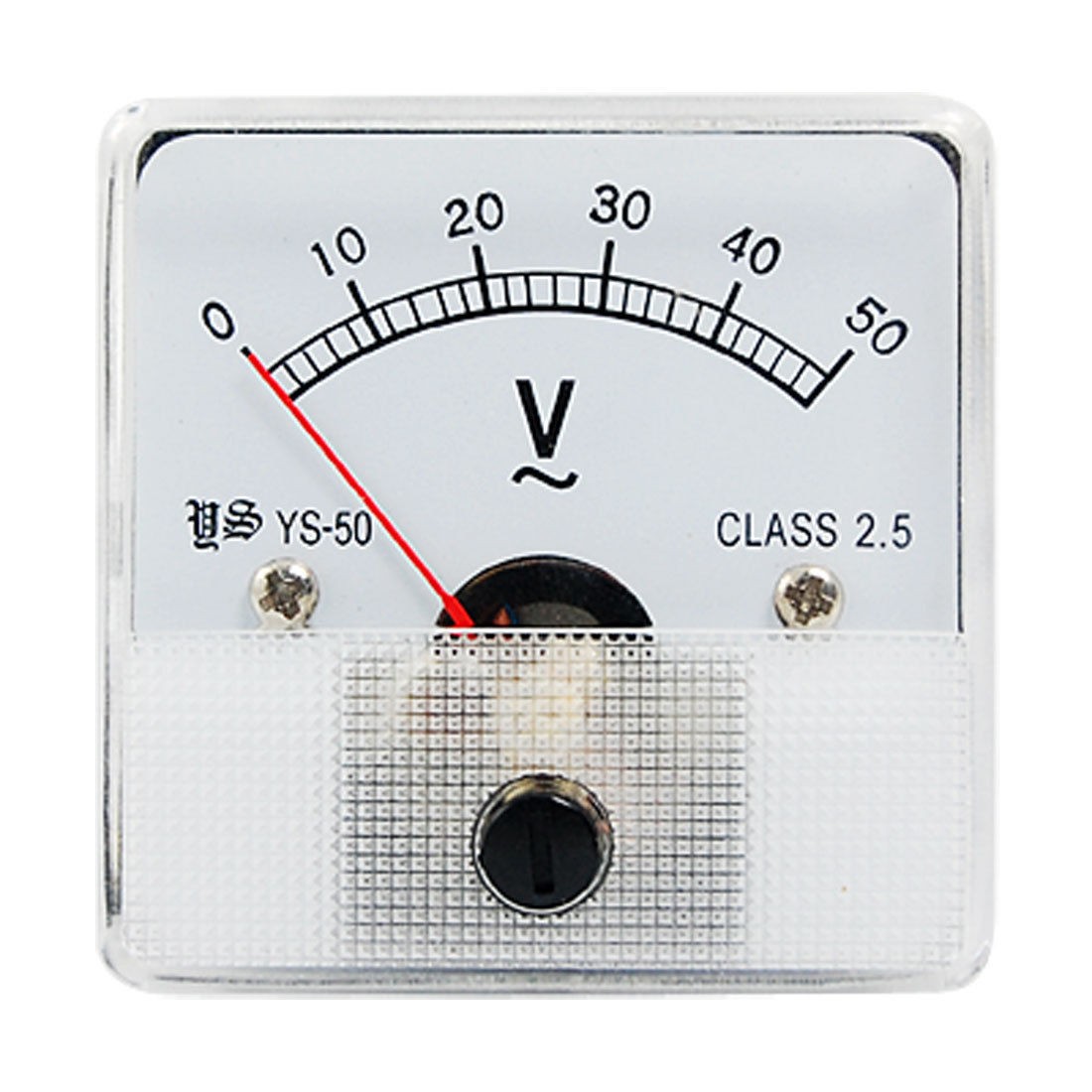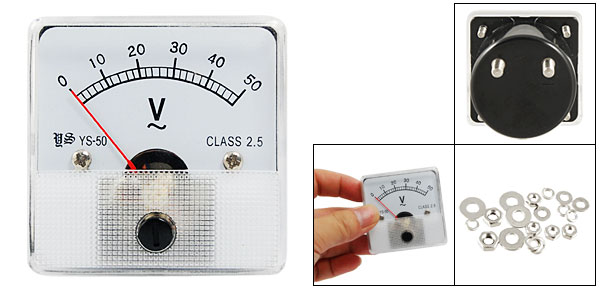 Product Name Analog Voltmeter Model No. YS-50 Measuring Voltage Range AC 0-50V Accuracy Class 2.5 Meter Face Size(Approx) 5 x 5 x 1.1cm / 2" x 2" x 0.4"(L*W*T) Thread Dia(Approx) Big One: 0.38cm / 0.150" Small One: 0.28cm / 0.110" Overall Depth 4.5cm / 1.8" Color Clear & White & Black Material Metal & Plastic Net Weight 59g Package Content 1 x Analog Voltmeter Several Installing Parts - Reviews