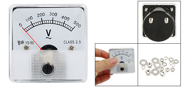 Product Name Analog Voltmeter Model No. YS-50 Measuring Voltage Range AC 0-500V Accuracy Class 2.5 Meter Face Size(Approx) 5 x 5 x 1.1cm / 2" x 2" x 0.4"(L*W*T) Thread Dia(Approx) Big One: 0.38cm / 0.150" Small One: 0.28cm / 0.110" Overall Depth 4.5cm / 1.8" Color Clear & White & Black Material Metal & Plastic Net Weight 59g Package Content 1 x Analog Voltmeter Several Installing Parts - Reviews