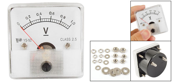 Product Name Analog Voltmeter Model No. YS-50 Measuring Voltage Range DC 0-1V Accuracy Class 2.5 Meter Face Size(Approx) 5 x 5 x 1.1cm / 2" x 2" x 0.4"(L*W*T) Thread Dia(Approx) Big One: 0.38cm / 0.150" Small One: 0.28cm / 0.110" Overall Depth 4.2cm / 1.6" Color Clear, White, Black Material Metal, Plastic Net Weight 57g Package Content 1 x Analog Voltmeter Several Installing Parts - Reviews