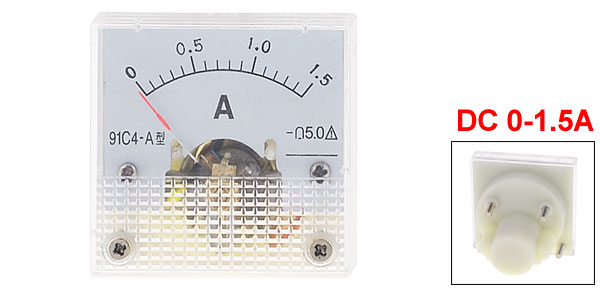 DetailsSquare Shape DC Current Panel Meter Amperemeter 0-1.5A  Product Name DC Current Panel Meter Model No. 91C4 Scale Range DC 0-1.5A Accuracy Class 5.0 Back Screw Diameter 3mm/ 0.12" Panel Size 4.5 x 4.5 x 0.9cm/ 1.8" x 1.8" x 0.4" (L*W*T) Overall Depth 4.5cm/ 1.8" Color White, Clear Main Material Plastic, Metal Weight 42g Package 1 x DC Current Panel Meter Some Install Parts