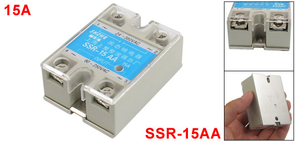 DetailsSSR-15AA AC to AC Covered Solid State Module Relay AC 80-250V AC 24-380V  Product Name Solid State Relay Type SSR-15AA Material Metal, Plastic Rated Load Current 15A Input AC 80-250V Output AC 24-380V Mounting Hole Size Small Dia:4.3mm/0.2" Big Size:7.1 x 4.3mm/0.3" x 0.2"(L*W) Total Size (Approx.) 6.2 x 4.4 x 2.6cm / 2.4" x 1.7" x 1" (L * W * H ) Color Gray, Clear,Silver Tone Weight 119g Package Content 1 x Solid State Module Relay
