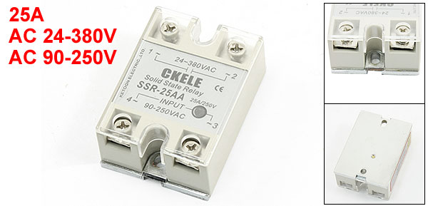 DetailsSSR-25AA 25A Single Phase AC to AC Solid State Module Relay w Cover  Product Name Solid State Relay Type SSR-25AA Rated Current 25A Input AC 24-380V Output AC 90-250V Relay Size 6 x 4.5 x 2.6cm/ 2.5" x 1.8" x 1"(L*W*T) Material Metal, Plastic, Electric Parts Main Color Silver Tone, Black Weight 124g Package Content 1 x Solid State Relay