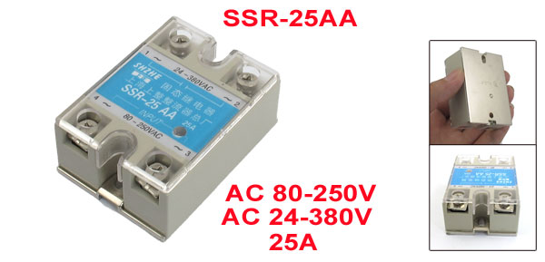 DetailsSSR-25AA AC to AC Covered Solid State Module Relay AC 80-250V AC 24-380V  Product Name Solid State Relay Type SSR-25AA Material Metal, Plastic Rated Load Current 25A Input AC 80-250V Output AC 24-380V Mounting Hole Size Small Dia:4.3mm/0.2" Big Size:7.1 x 4.3mm/0.3" x 0.2"(L*W) Total Size (Approx.) 6.2 x 4.4 x 2.6cm / 2.4" x 1.7" x 1" (L * W * H ) Color Gray, Clear,Silver Tone Weight 119g Package Content 1 x Solid State Module Relay