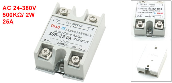 Product Name Solid State Module Relay Type SSR-25VA Rated Current 25A Output AC 24-380V Resistance 500KΩ/ 2W Relay Size 6.3 x 4.5 x 2.3cm/ 2.5" x 1.8" x 0.9"(L*W*T) Materials Plastic, Electric Part Main Color Silver Tone, Gray Weight 118g Package Content 1 x Solid State Module Relay - Reviews
