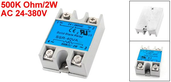 Product Name Solid State Relay Type SSR-40VA Input 500K Ohm/2W Output AC 24-380V Rated Current 40VA Total Size (Approx.) 64 x 45 x 23mm/ 2.4" x 1.8" x 0.91"(L*W*T) Material Plastic, Electric Part Color Gray, Silver Tone Net Weight 105g Package Content 1 x Solid State Relay